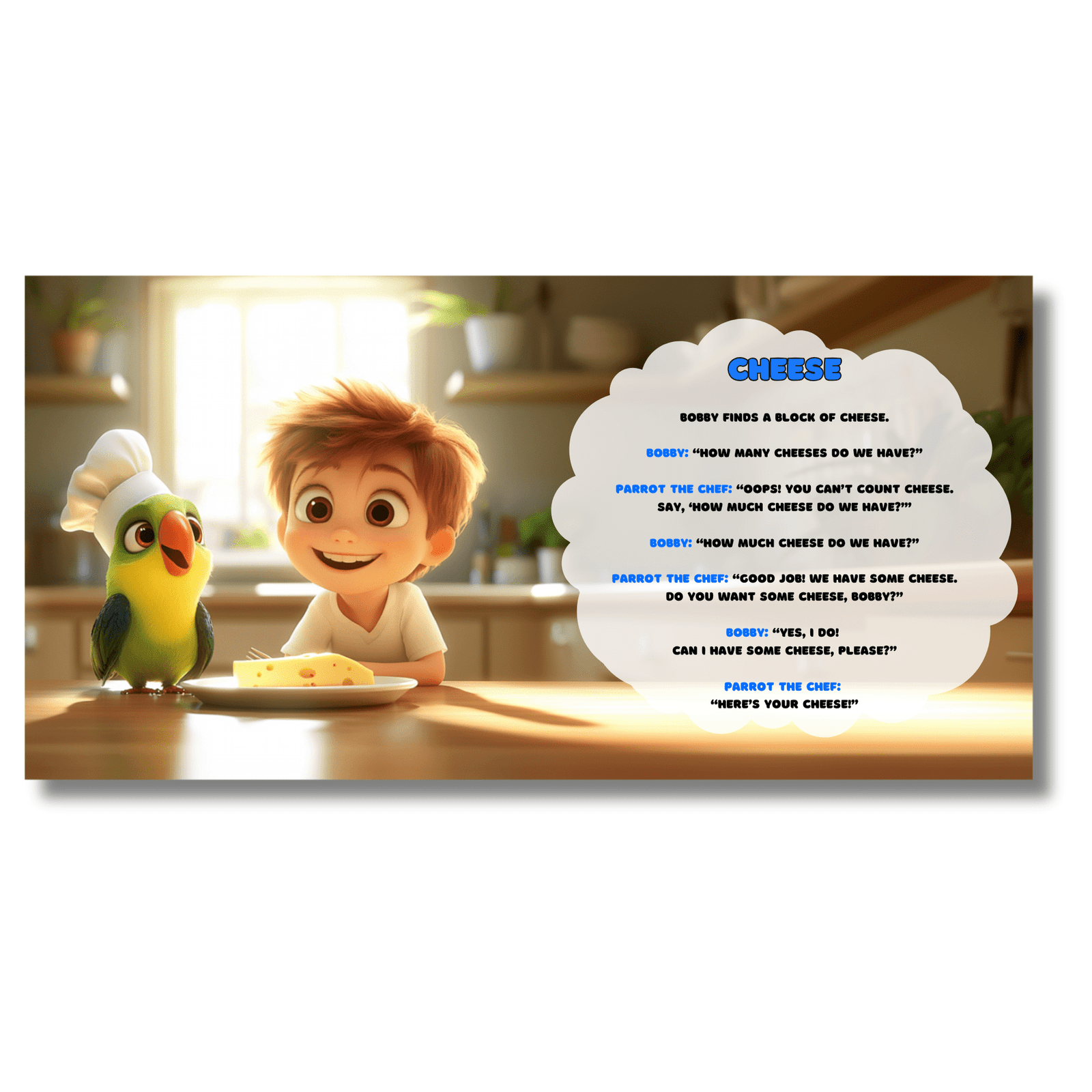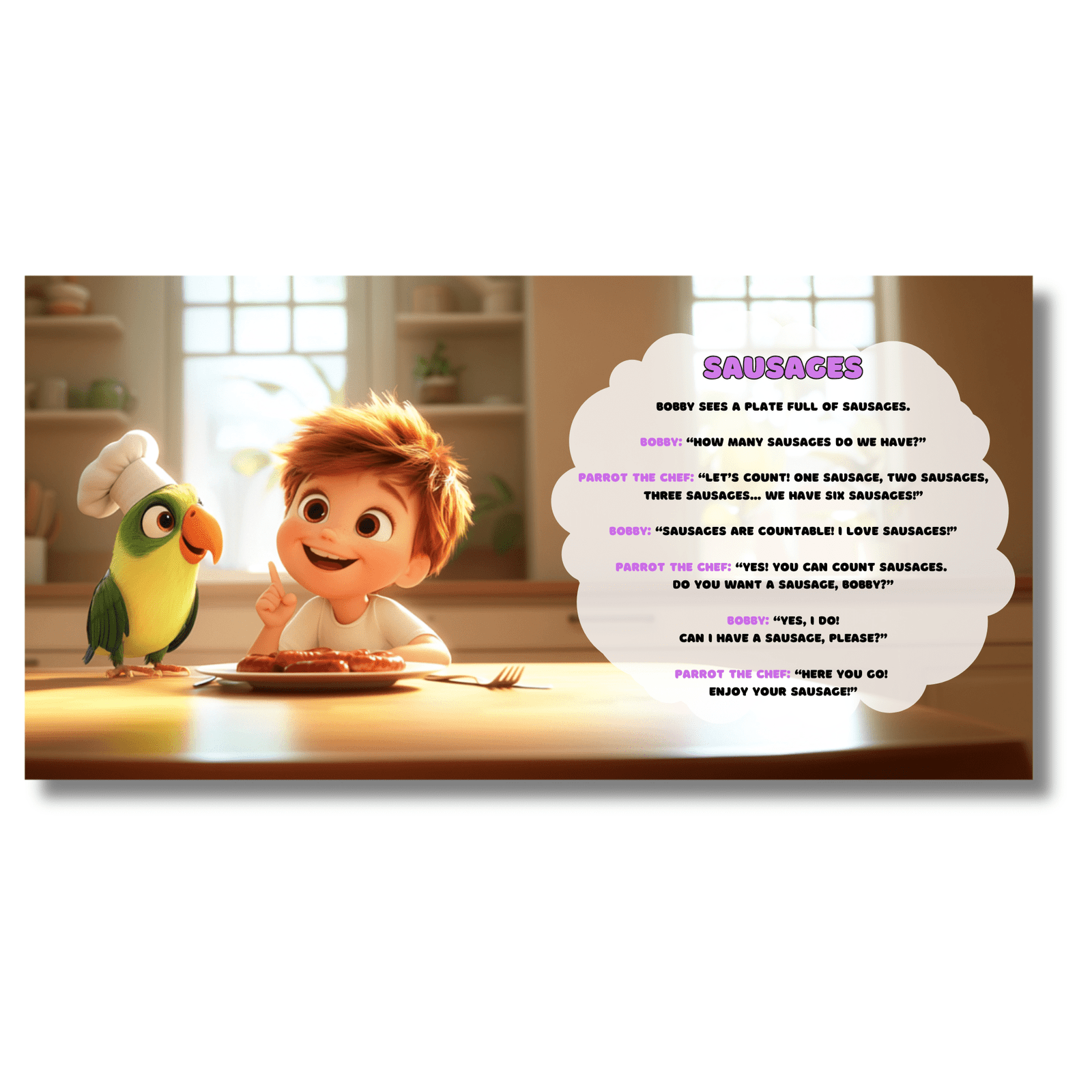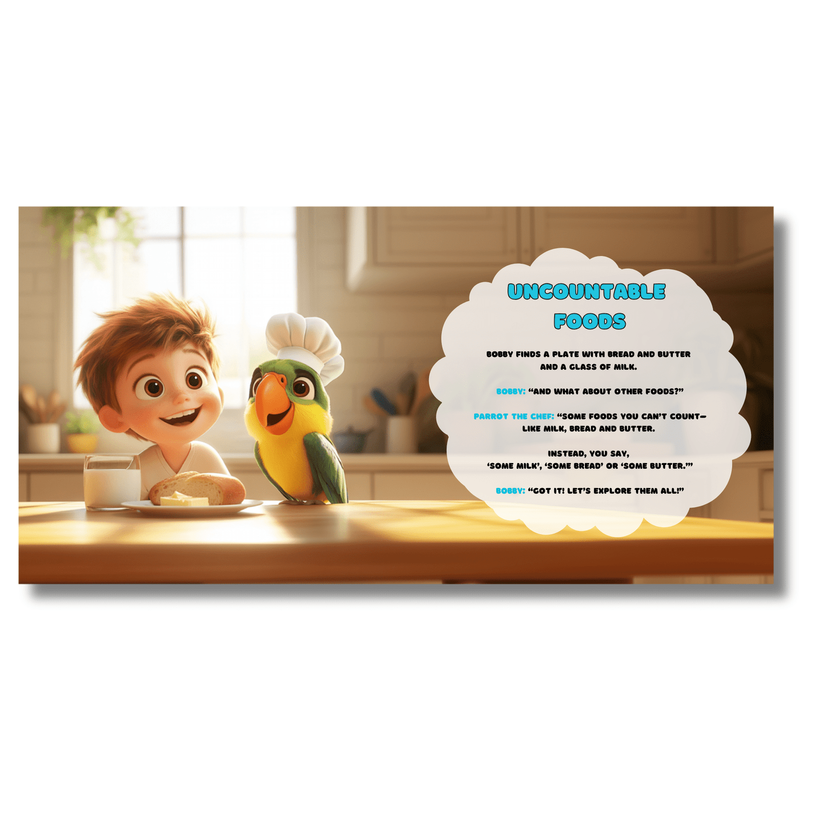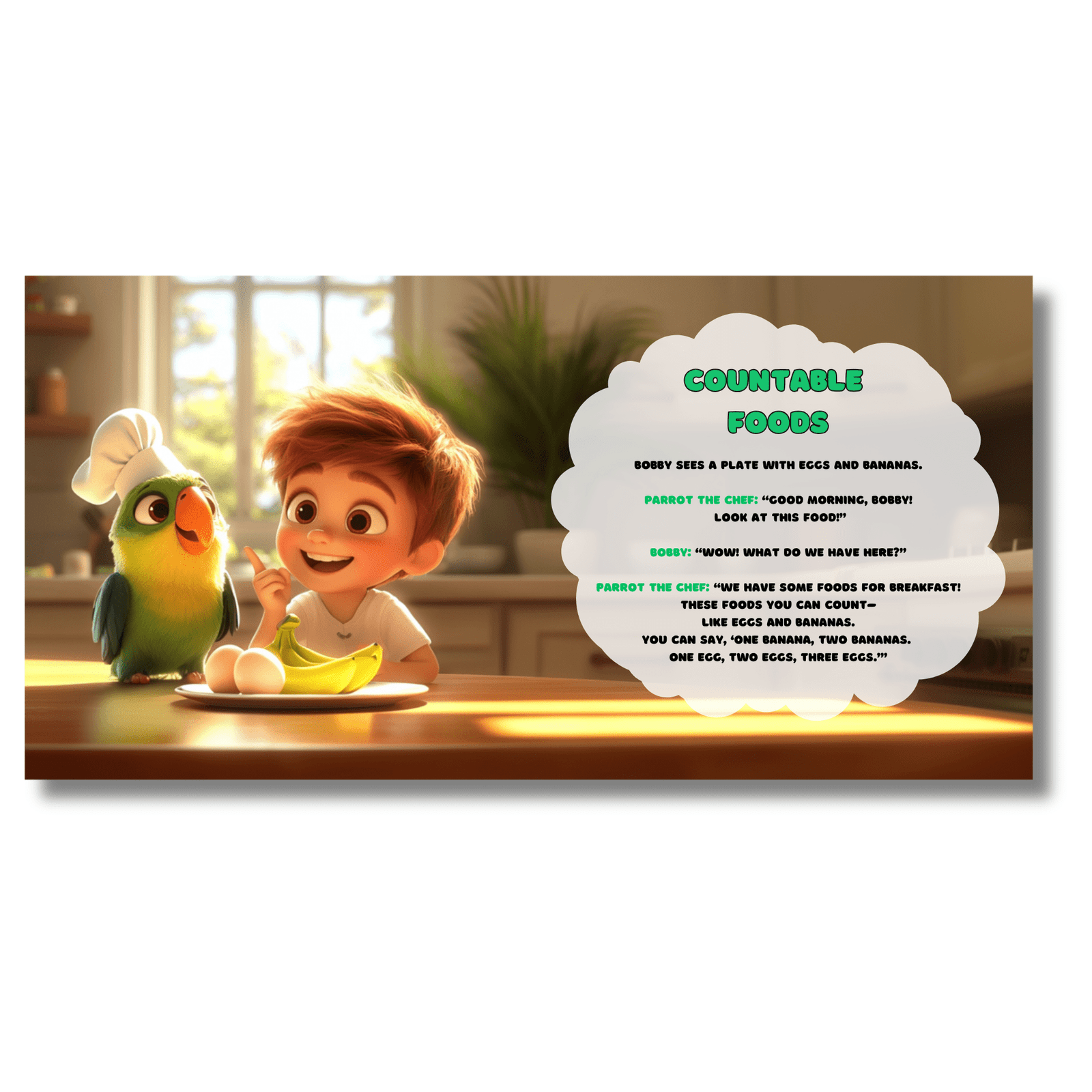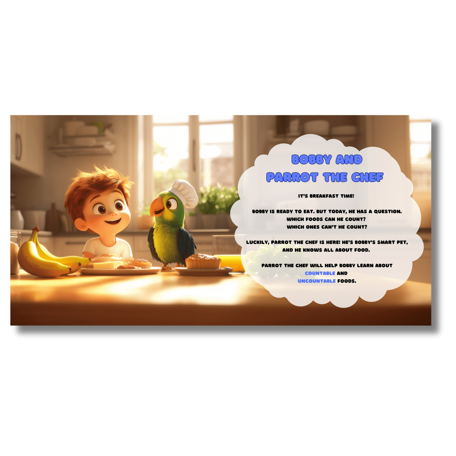 The storybook “Bobby's Breakfast Bonanza” introduces key grammar and vocabulary in a fun, engaging way, while the workbook provides hands-on activities to reinforce learning.