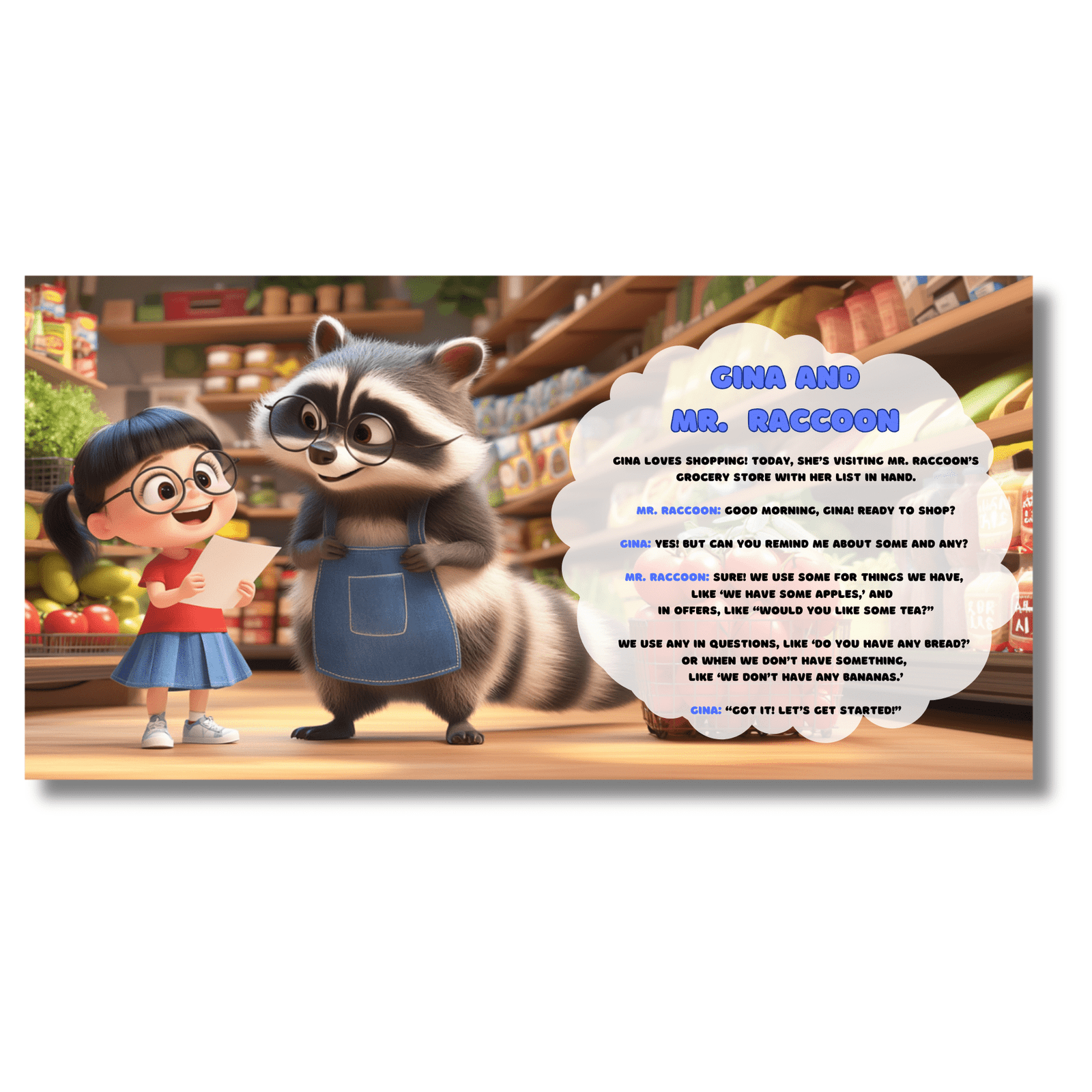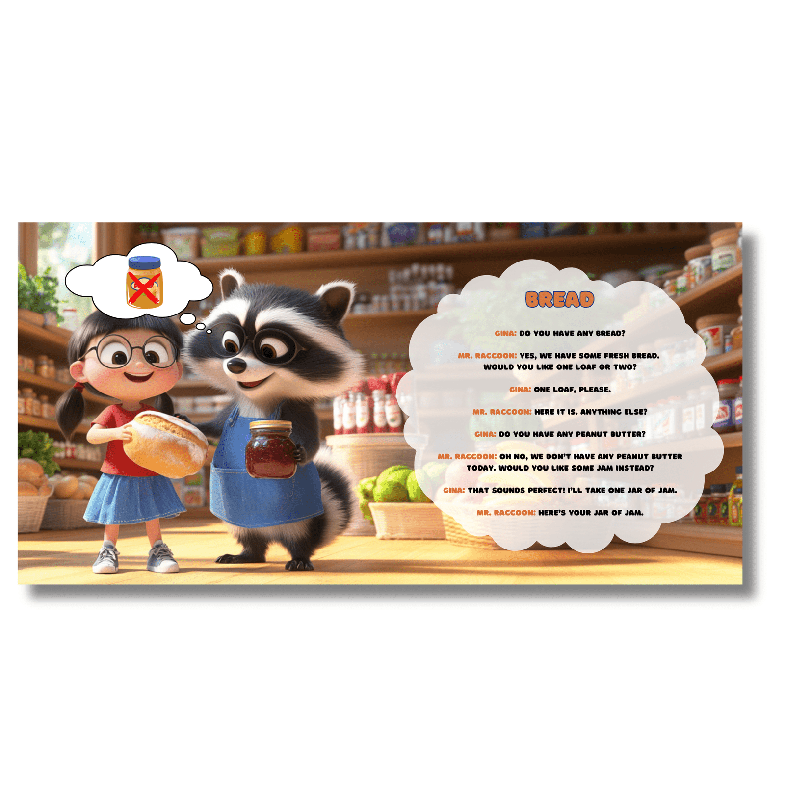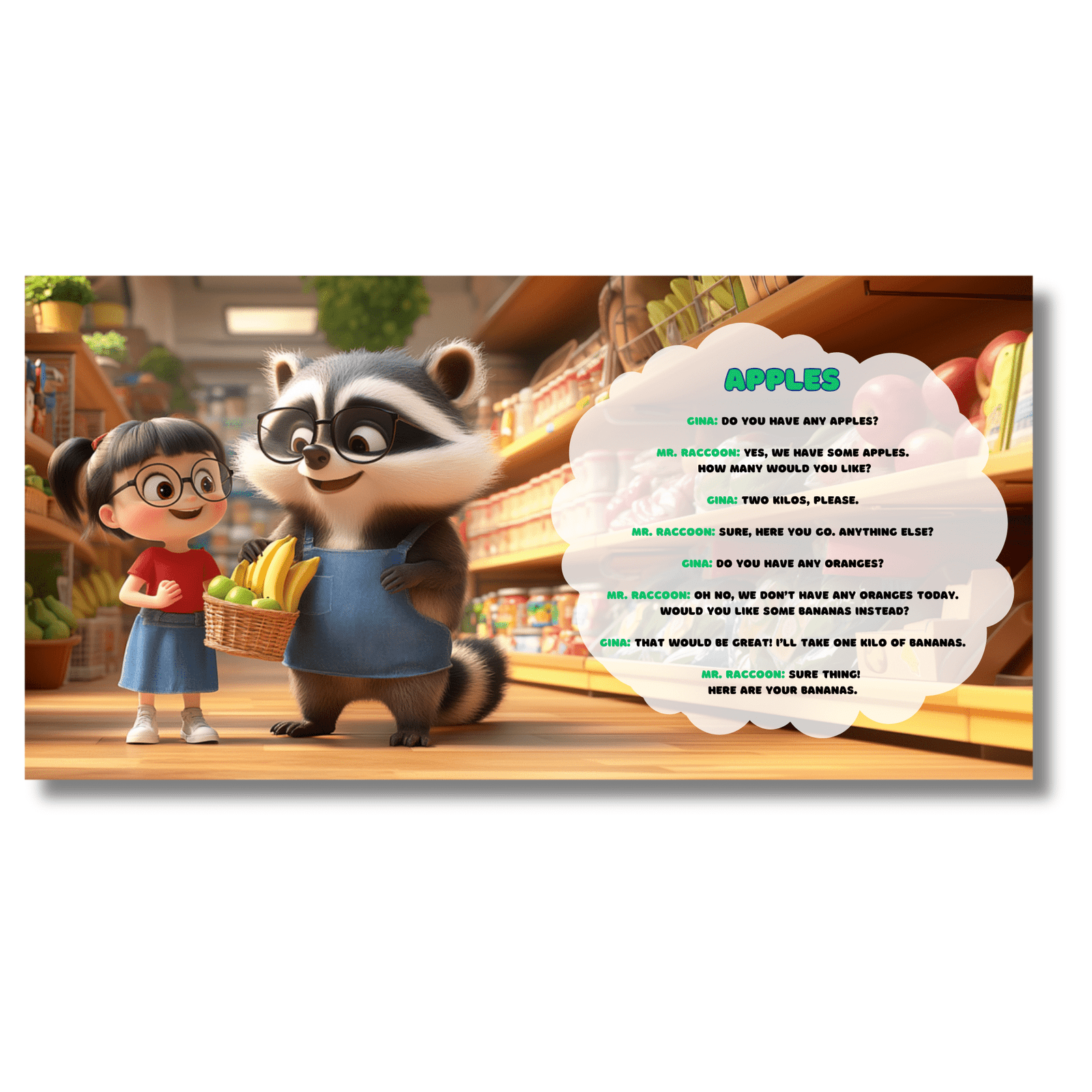 The storybook “Gina’s Grocery Shopping” introduces key grammar and vocabulary in a fun, engaging way, while the workbook provides hands-on activities to reinforce learning.